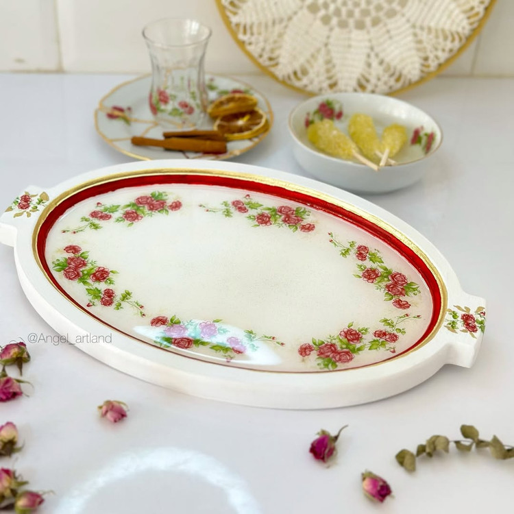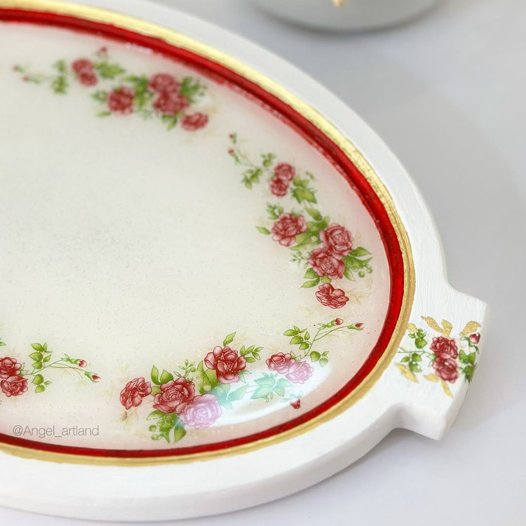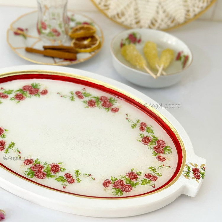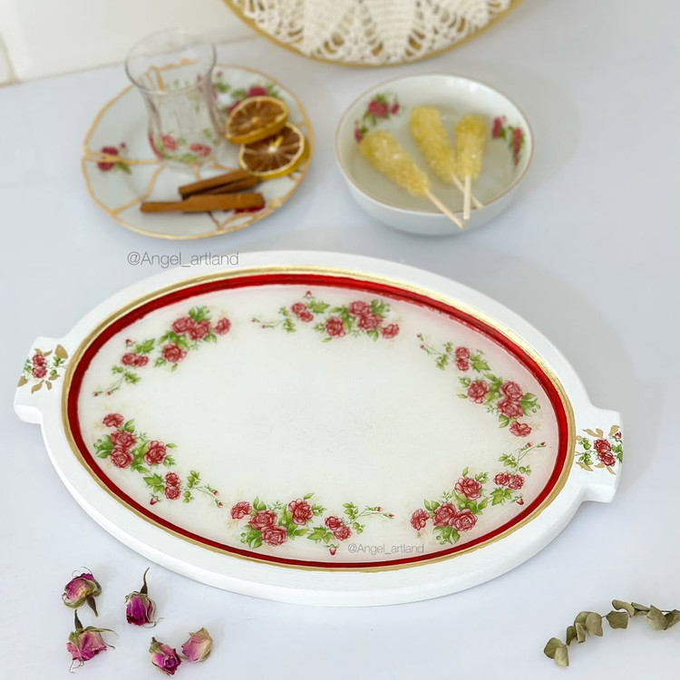 این سینی ترکیبی از سه هنر دکوپاژ، پتینه و رزین است. جنس سینی چوب هستش و طرح گل سرخی بر روی آن دکوپاژ شده، پتینه کاری روی سینی انجام شده و سپس برای شفافیت و ضدآب شدن بیشترش کف سینی رزین و اکلیل هفت رنگ ریخته شده.