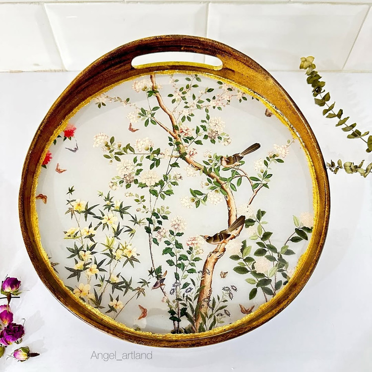 این سینی قشنگم با شاپان کار شده و طرح چوب داره کف سینی کاملا با رزین ضدآب شده و اصلا سُر نیست، میتونید داخلش لیوان چایی بزارید و خیالتون راحت باشه میتونید بعنوان دکور استفاده کنید و یا هرکاربردی که دوس دارید آجیل ، میوه، اکسسوری و … .