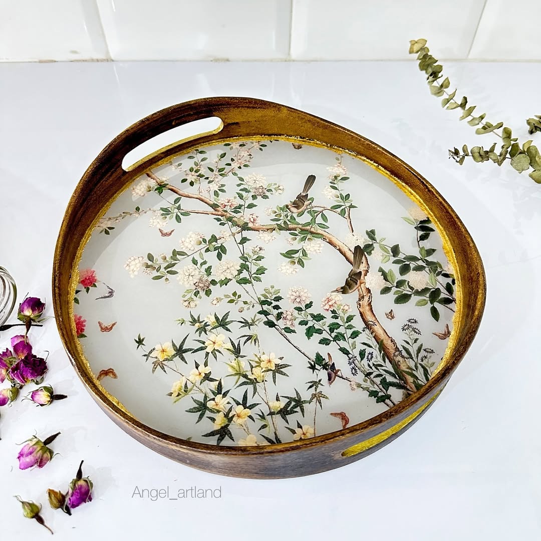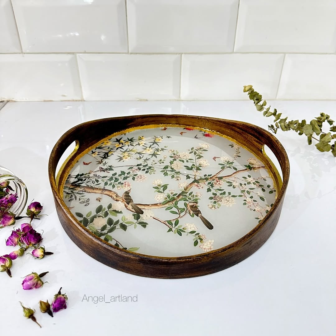 این سینی قشنگم با شاپان کار شده و طرح چوب داره کف سینی کاملا با رزین ضدآب شده و اصلا سُر نیست، میتونید داخلش لیوان چایی بزارید و خیالتون راحت باشه میتونید بعنوان دکور استفاده کنید و یا هرکاربردی که دوس دارید آجیل ، میوه، اکسسوری و … .