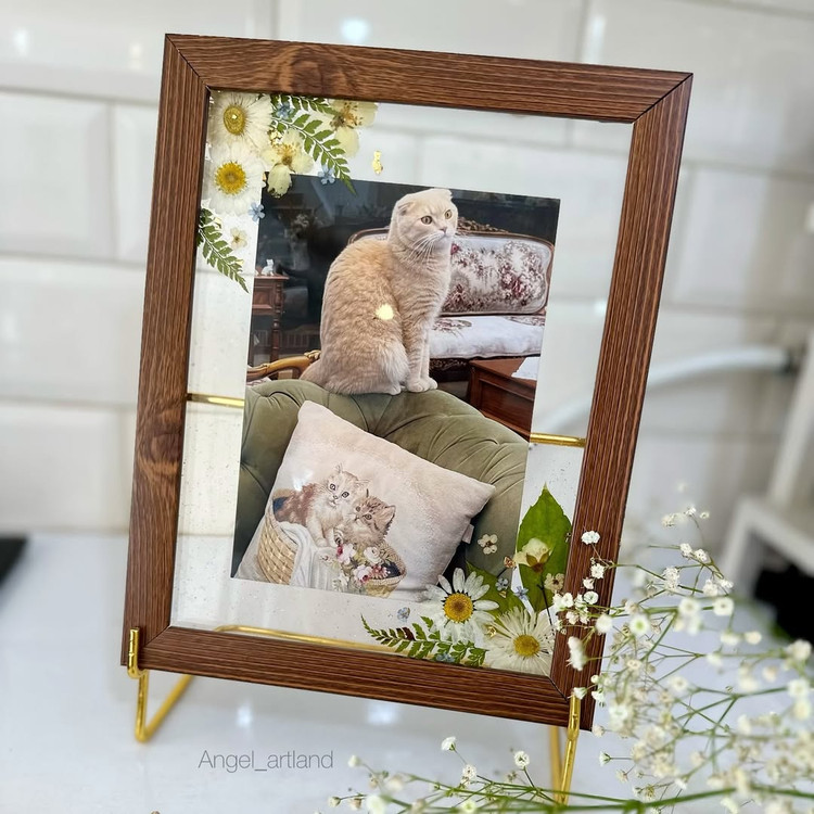 این قاب با هنر رزین طراحی شده و شامل گلهای طبیعی و اکلیل میباشد.