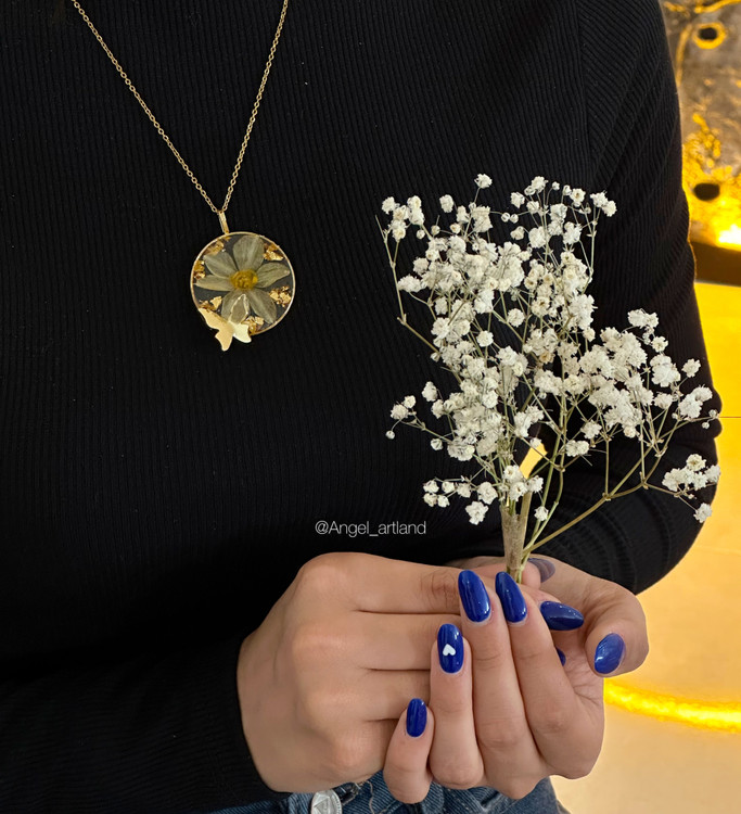 درون این گردنبند، گلهای طبیعی با دقت خشک و در رزین شفاف نگهداری شدهاند تا زیبایی و طراوت آنها برای همیشه ماندگار بماند.