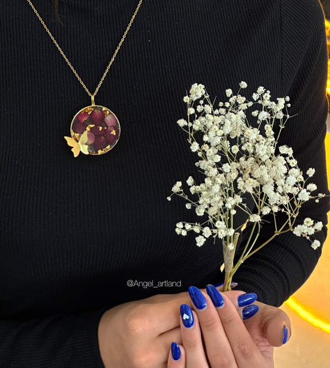درون این گردنبند، گلهای طبیعی با دقت خشک و در رزین شفاف نگهداری شدهاند تا زیبایی و طراوت آنها برای همیشه ماندگار بماند.