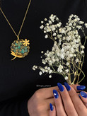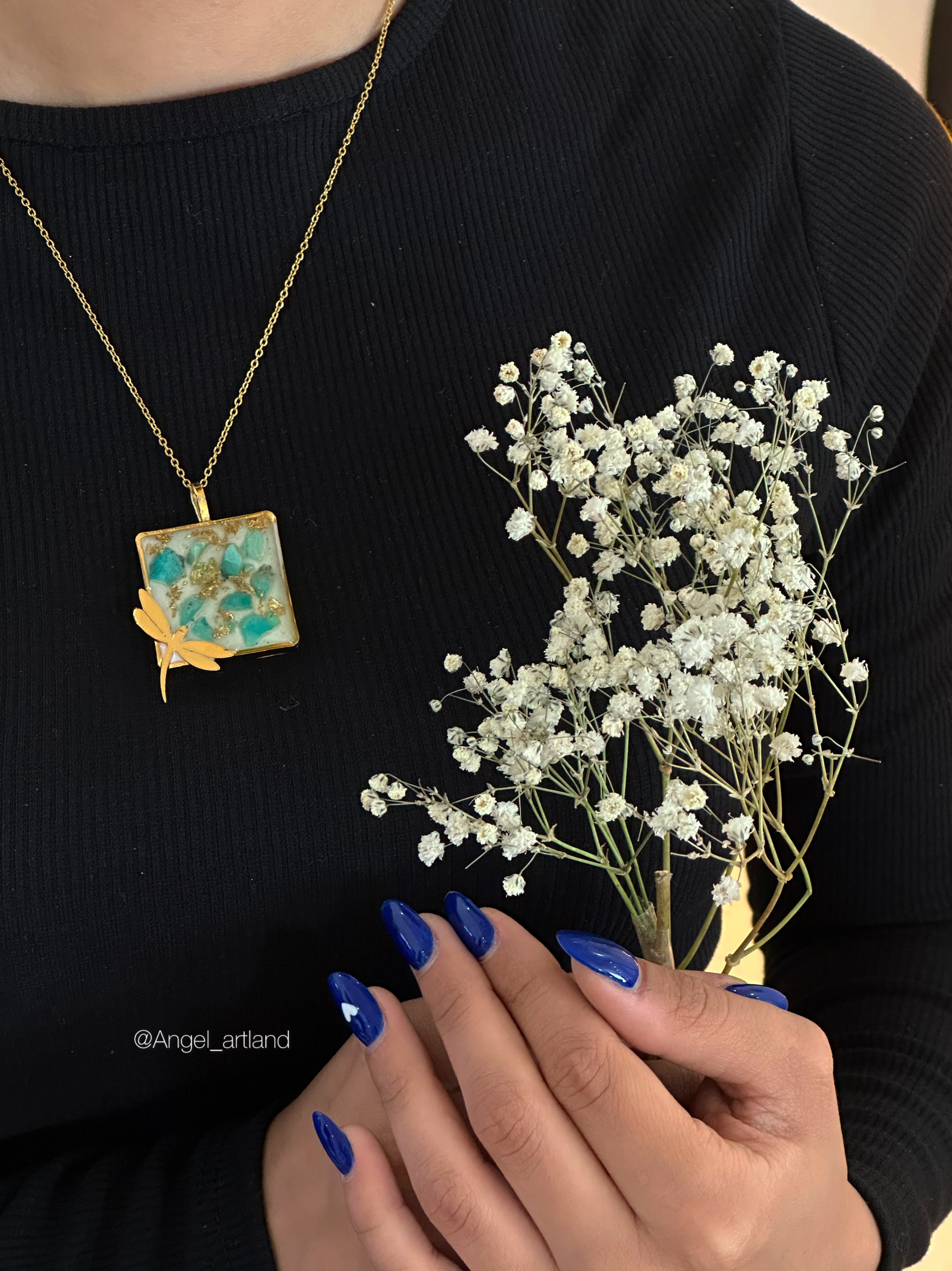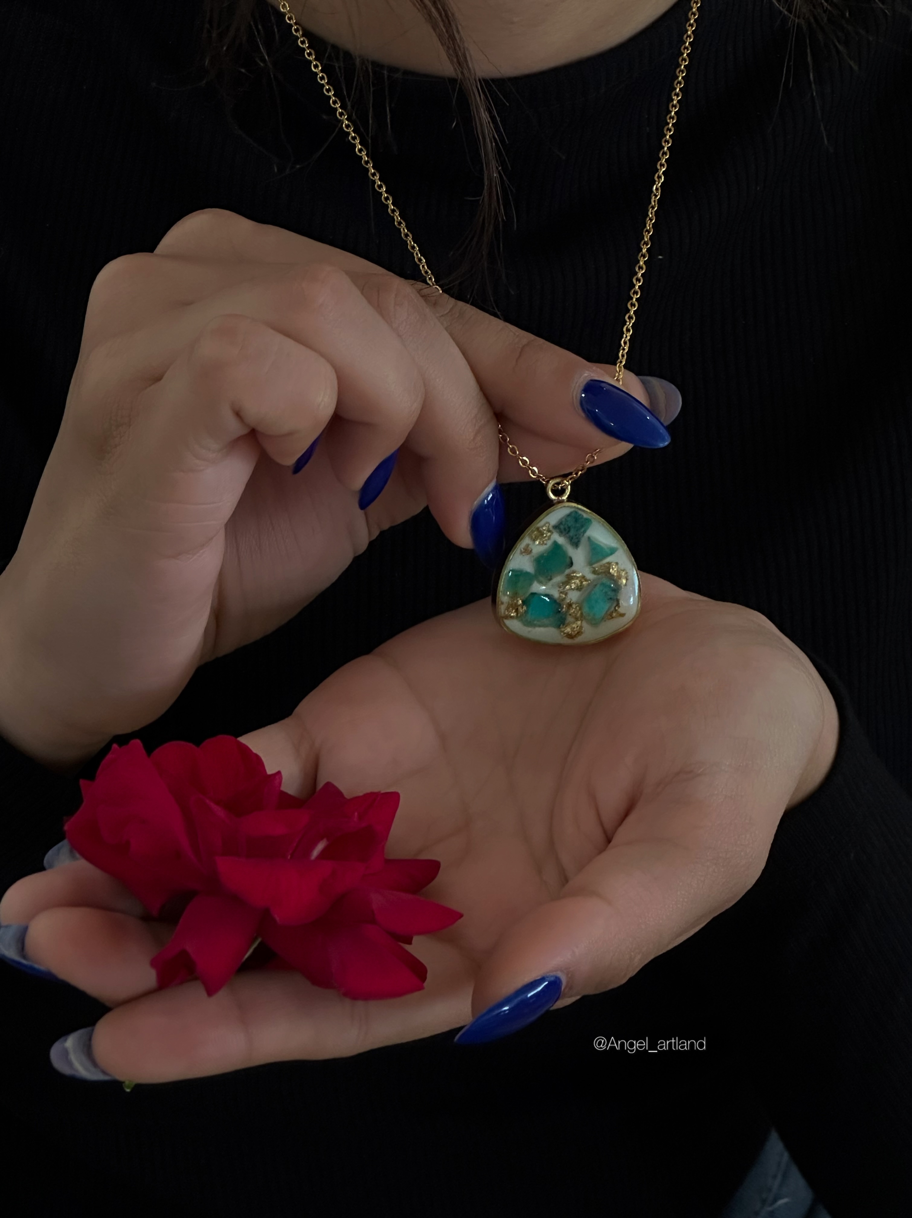در این گردنبند، سنگ فیروزه طبیعی در کنار رزین شفاف قرار گرفته تا ترکیبی هماهنگ از انرژی مثبت و زیبایی خلق کند.